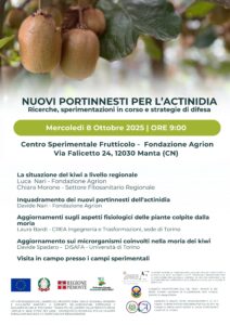 Mercoledì 8 Ottobre 2025, alle ore 09:00 presso il centro sperimentale per la frutticoltura di Fondazione Agrion – Via Falicetto 24, 12030 Manta (CN), si terrà l’incontro dal titolo “NUOVI PORTINNESTI PER L’ACTINIDIA – Ricerche, sperimentazioni in corso e strategie di difesa”.