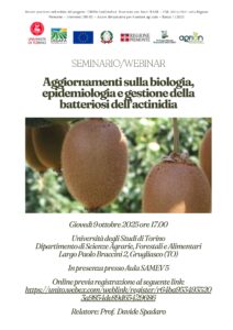 Giovedì 9 Ottobre 2025, alle ore 17:00 presso l’Università degli Studi di Torino – Dipartimento di Scienze Agrarie, Forestali e Alimentari in via Largo Paolo Braccini 2, Grugliasco (TO), si terrà il seminario/webinar dal titolo “Aggiornamenti sulla biologia, epidemiologia e gestione della batteriosi dell’actinidia”.