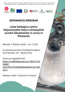 Martedì 7 Ottobre 2025, alle ore 15:30 presso il centro sperimentale per la frutticoltura di Fondazione Agrion – Via Falicetto 24, 12030 Manta (CN), si terrà il seminario/webinar dal titolo “Lotta biologica contro Halyomorpha Halys e Drosophila suzukii attualmente in corso in Piemonte ”.