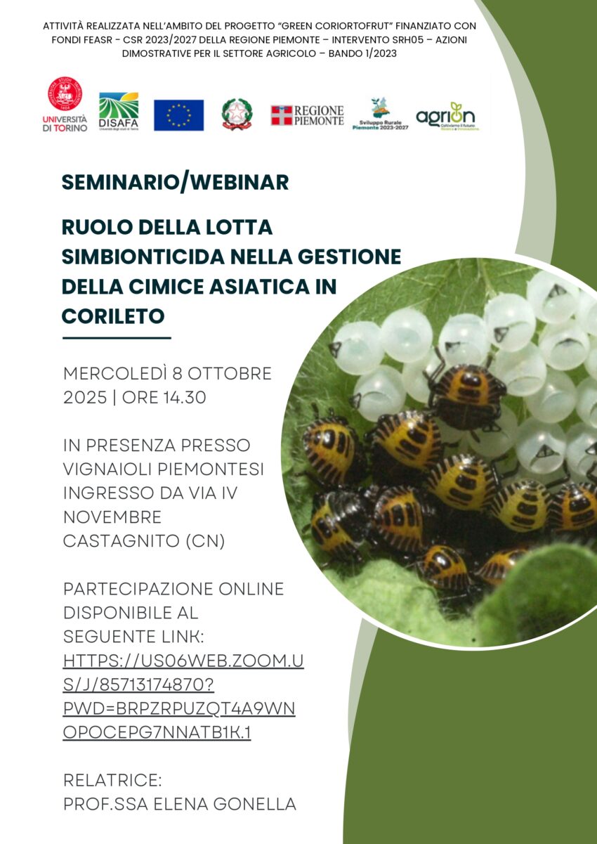 Mercoledì 8 Ottobre 2025, alle ore 14:30 presso Vignaioli Piemontesi, ingresso da Via IV Novembre – Castagnito (CN), si terrà il seminario/webinar dal titolo “Ruolo della lotta simbionticida nella gestione della cimice asiatica in corileto ”.