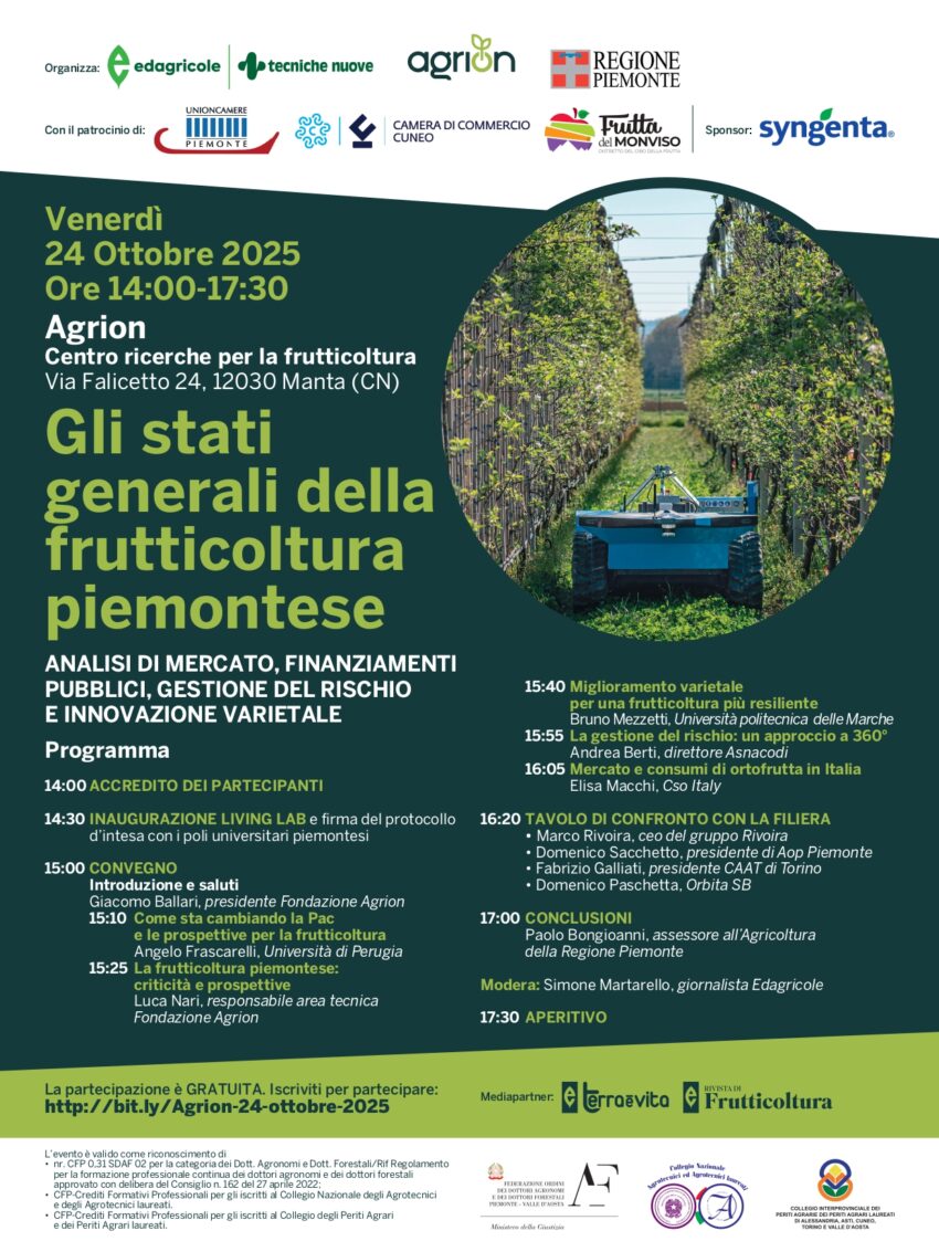 Venerdì 24 ottobre 2025 alle ore 14:00, presso il Centro Sperimentale di Fondazione Agrion – Via Falicetto 24, 12030 Manta (CN), si terrà l’evento “Gli stati generali della frutticoltura piemontese: Analisi di mercato, finanziamenti pubblici, gestione del rischio e innovazione varietale”, un’importante occasione di confronto organizzato da Fondazione Agrion, Edagricole e Tecniche Nuove.