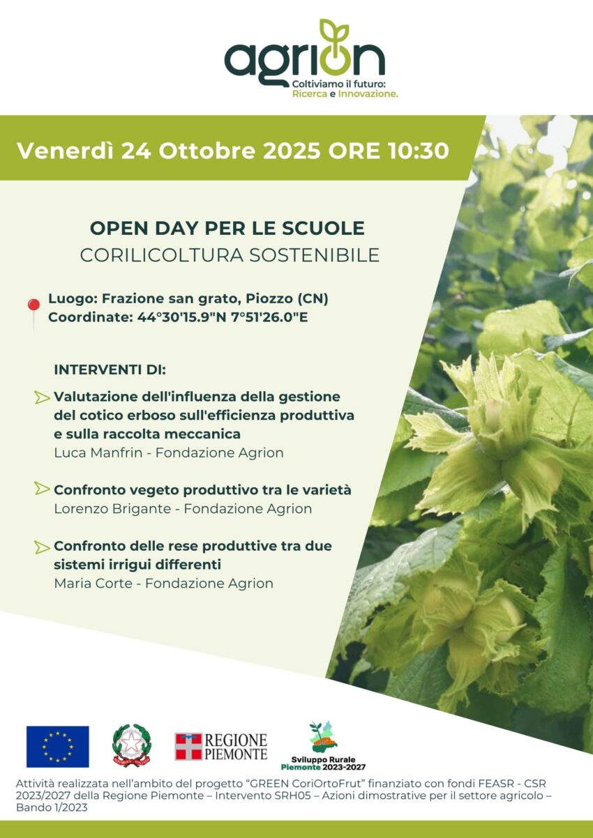 Venerdì 24 Ottobre 2025, alle ore 10:30 presso la Frazione san grato, Piozzo (CN), si terrà l’open day per le scuole dal titolo “Confronto varietale, prove di inerbimento ed irrigazione mirata per una corilicoltura sostenibile”